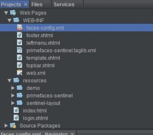 • Descomprimo  y copio al WEB-INF  del prioyecto desde tag->src->main->webapp->WEB-INF los siguientes archivos: face-config.xml, footer.xhtml, leftmenu.xhtml, primefaces-sentinel.taglib.xml, template.xhtml, topbar.xhtrml, web.xml todo el directorio resources